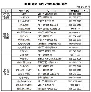 인천시는 설 연휴 기간인 14~18일 시·군·구 보건소에서 응급진료상황실을 운영하고 응급의료기관과 병·의원, 약국 등을 중심으로 응급진료체계를 가동한다고 9일 밝혔다.시에 따르면 설 연휴 기간 인천에서는 응급의료기관 21개소와 응급의료시설 5개소, 소아전문응급의료센터