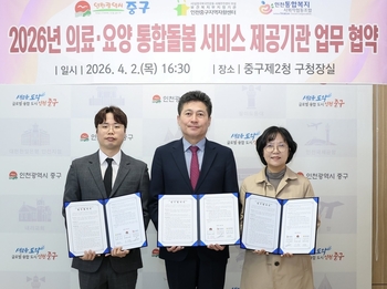 인천시 중구는 최근 제2청 구청장실에서 ‘지역사회 통합돌봄망’ 구축을 위해 복지 서비스 제공기관, 의료기관과 업무 협약을 체결했다고 5일 밝혔다.협약은 의료·요양 등 지역 돌봄의 통합지원에 관한 법률에 따라 지난달부터 전국적으로 추진 중인 ‘의료·요양 통합돌봄 사업’의